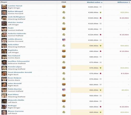 本次身价更新中,亚马尔身价保持不变,仍为2亿欧。姆巴佩身价上涨2000万欧,与亚马尔并列第一。贝林厄姆身价下跌2000万欧,跌至1.6亿欧元,位列第三。维尼修斯和佩德里身价保持不变,分列第四、第五。巴尔韦德身价下跌1000万欧,身价来到1.2亿。阿尔瓦雷斯身价保持不变,保持在1亿关口。这样,本次身价更新后,西甲有七位球员身价上亿。